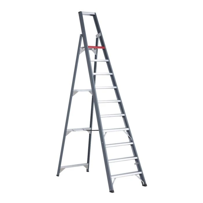 De grijze coating is niet alleen stijlvol. Het is bovendien vuilafstotend en geeft niet af aan je handen. Door de schetsschoren en grote voeten weet je zeker dat je stabiel staat. De steunbeugel is niet alleen veilig. Het bakje in de beugel geeft je ook een plek voor je gereedschap.