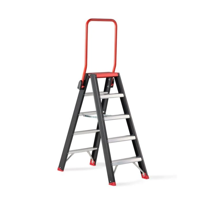 De trap met top eigenschappen. Dubbel oploopbaar dus aan beide zijden te gebruiken. Gebruiksvriendelijk en robuust. Speciaal voor de professional die meer vraagt. De Taurus is gemaakt voor intensief gebruik. Het unieke scharniersysteem van het bordes maakt de trap opvallend veilig in gebruik.