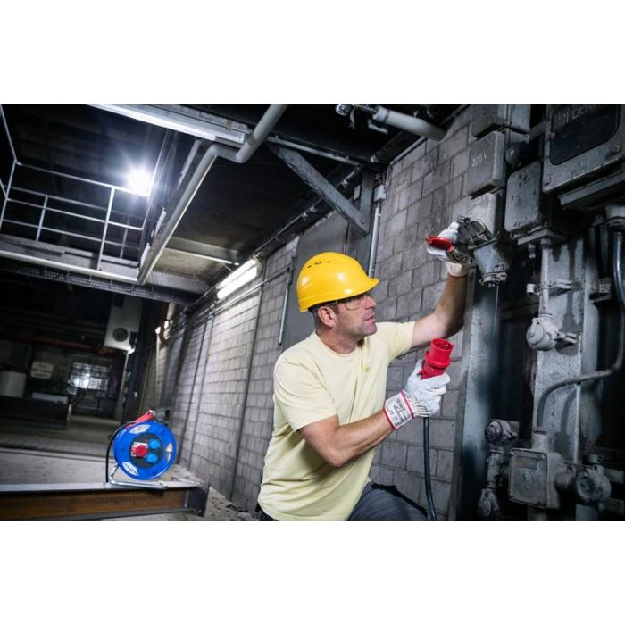 Conform EN61316. Haspel uit breukvast kunststof op roestvrij gegalvaniseerd draagbaar frame. Innovatieve handgreep met “cablepilot” voor perfecte kabelgeleiding. Beweegt naar beide kanten, voor soepel dragen en ophangen. Categorie 2 (K2) apparatuur: Voor gebruik in ruwe omgevingen met hoge mechanische, fysische en chemische belasting. De RN-kabel is getest voor zware bouwomstandigheden conform VDE 0100 deel 704. 1 CEE-stekker 400 V/16 A, 1 CEE-stopcontact 400 V/16 A , 2 spatwaterdichte stopcontacten 230 V. Geaarde contactdozen verdeeld over aparte fasen. Met 3-polige veiligheidsuitschakeling en oververhittingsbescherming.