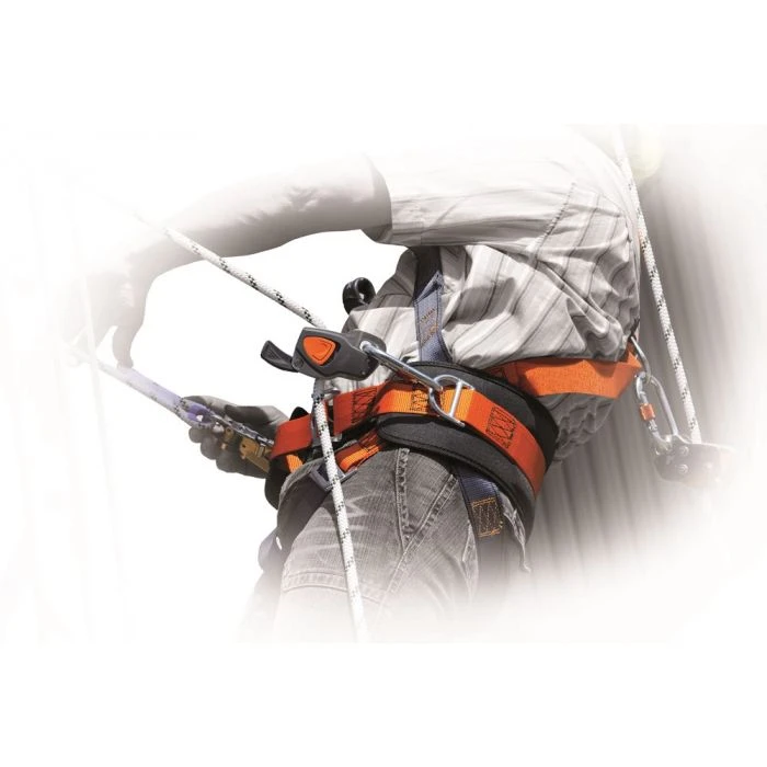 Multifunctioneel 3-in-1 product: 1- Valstopapparaat schuivend op een ankerlijn van gevlochten touw Ø 10,5 – 11mm + 1 AM002. 2- Touwklem op het koord: dankzij de regeleenheid van dit toestel – op het veiligheidskoord (type A) – volgt het de gebruiker wanneer deze van positie verandert en blokkeert het bij een statische of een dynamisch belasting. 3- Touwklem op het koord: als klimtoestel op de werklijn blokkeert dit toestel onder invloed van een belasting in één richting en glijdt vrij in de tegenovergestelde richting (type B) (zie ook omschrijving van de EX030). Kunststof/Staal. Karabijnhaak: Staal.