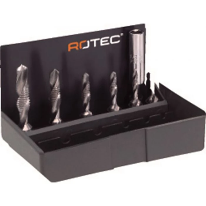 Boren, tappen en ontbramen in één arbeidsgang. Geschikt voor non-ferro, metaal en kunststof.