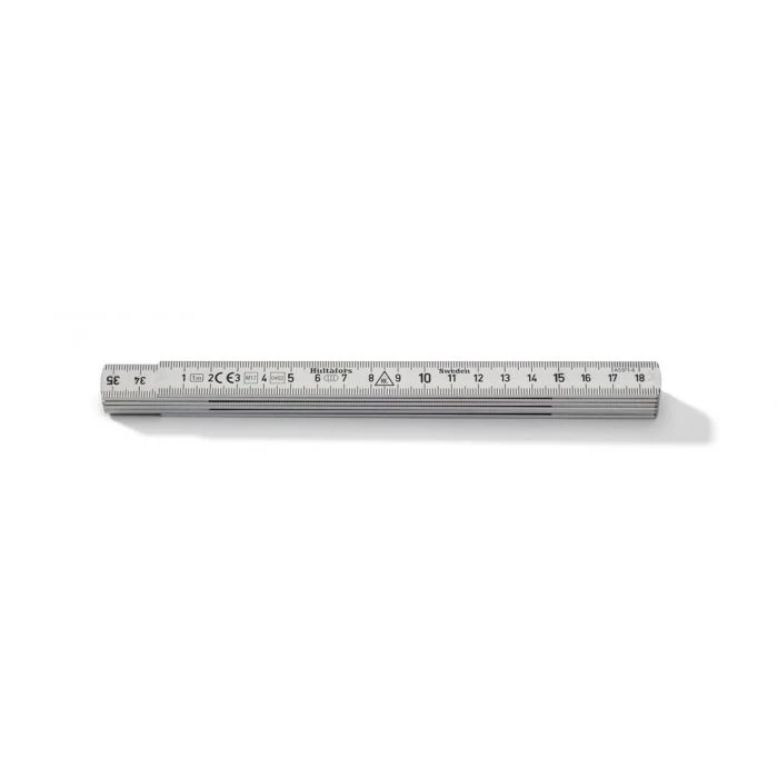 Een duimstok van geanodiseerd aluminium met verbindingen van gegalvaniseerd staal. Schaalverdeling met zwarte cijfers op beide zijden, metrisch aan de onderkant en Brits aan de bovenkant. Goede weerstand tegen vocht, warmte en slijtage.