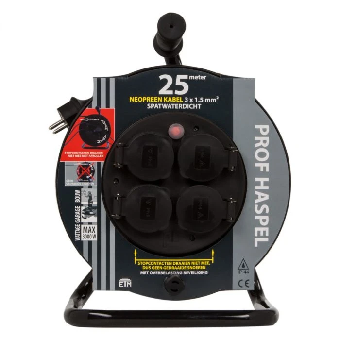 Met randaarde. Voorzien van overbelasting beveiliging. Met neopreen kabel. Spatwaterdicht (IP44). Stopcontacten draaien niet mee met afrollen, dus geen gedraaide snoeren. Maximaal 3000 Watt, opgerold maximaal 750 Watt.