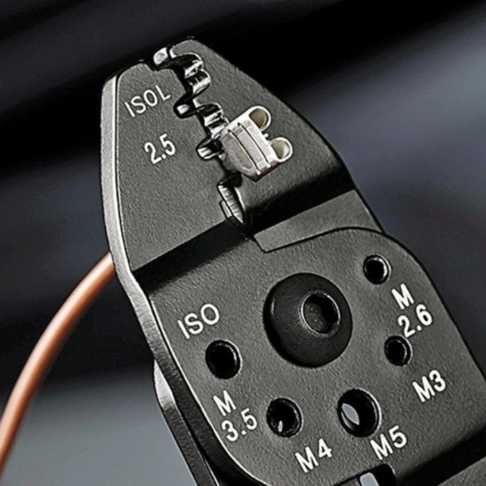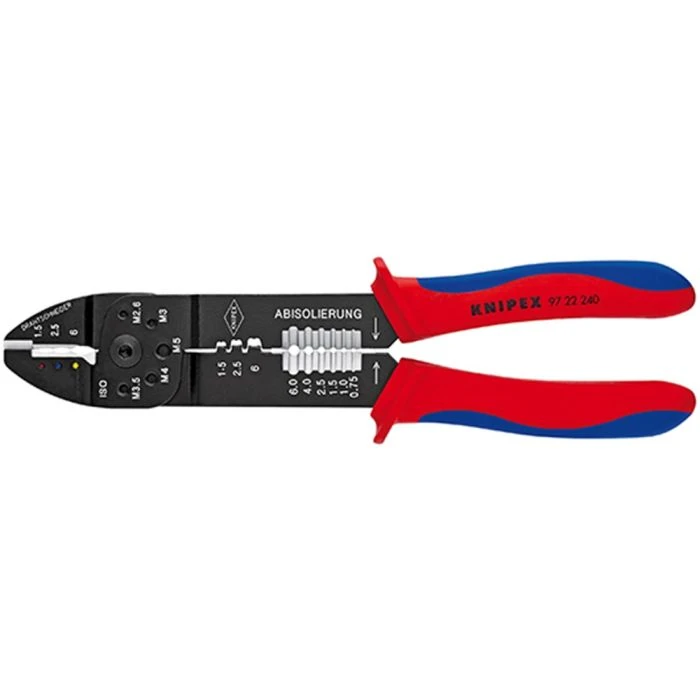 Voor het knippen van kabels, het afstrippen van draden en het krimpen van geïsoleerde en niet-geïsoleerde kabelschoenen, aansluitstekkers en open aansluitstekkers. Met schroefdraadgaten voor het knippen van koper- of messing-schroefdraadpennen met M 2,6- M 3- M 3,5- M 4 en M 5. Geschroefd scharnier voor een hoge stabiliteit en gelijkmatige beweging. Speciaal staal, zeer bestendig.