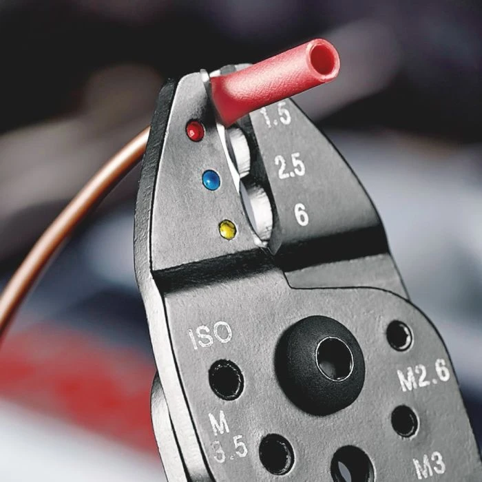 - Voor het knippen van kabels, het afstrippen van draden en het krimpen van geïsoleerde en niet-geïsoleerde kabelschoenen, aansluitstekkers en open aansluitstekkers