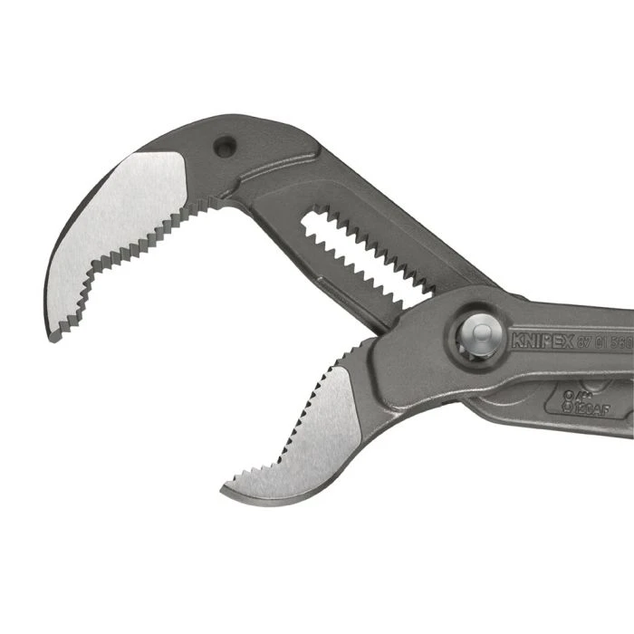 Pijp- en waterpomptang in één. Zelfklemmend op buizen en moeren: glijdt niet van het werkstuk af en werkt krachtbesparend. Snelle en precieze instelling, direct op het werkstuk. Geen onbedoelde verstelling mogelijk. Geen doorschieten van het scharnier. Fijnverstelling. Optimale hefboomwerking. In veel situaties als schroefsleutel inzetbaar. Grijpvlakken met speciaalgeharde tanden, hardheid van de tanden ca. 61 HRC: steeds weer veilig grijpen dankzij hoge slijtvastheid. Chroom-Vanadium elektrostaal, in olie gehard en getemperd Model: Grijpwijdte voor buizen tot 3 1/2″ met een lengte van een 1 1/2″-pijptang. 20% minder gewicht dan vergelijkbare pijptangen. Vestelbaar op 27 niveaus.