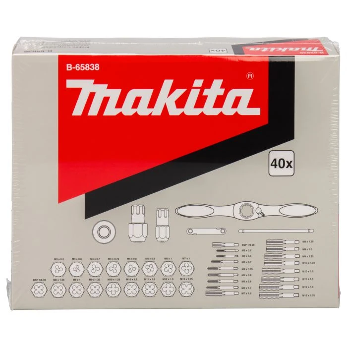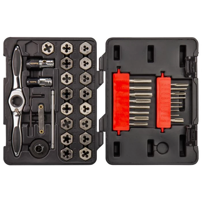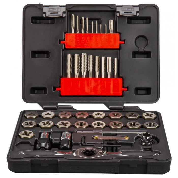 Bestaat uit snijplaathouder, kleine tap adapter, middelgrote tap adapter, middelgrote zeskant snijplaat adapter, schroevendraaier, schroefdraadmeter, NC Hex snijplaat 3mmx0.50, 3mmx0.60, 4mm x 0.70, 4mm x 0.75, 5mm x 0.80, 5mm x 0.90, 6mm x 1.00, 7mm x 1.00, 8mm x 1.25, 9mm x 1.25, 10mm x 1.50, 11mm x 1.50, 12mm x 1.75, NC plug tap 8mm x 1.25, 9mm x 1.25, 10mm x 1.50, 11mm x 1.50, 12mm x 1.75, NC Taper Tap 3mm x 0.50, 3mm x 0.60, 4mm x 0.70, 4mm x 0.75, 5mm x 0.80, 5mm x 0.90, 6mm x 1.00 , 7mm x 1.00, NF Hex snijplaat 9mm x 1.00, 10mm x 1.25, 12mm x 1.50, NF Plug Tap 9mm x 1.00, 10mm x 1.25, 12mm x 1.50 , BSP Hex snijplaat 1/8-28, BSP Tap1/8-28.