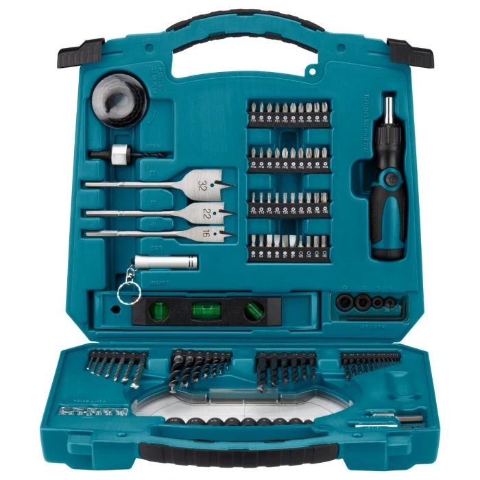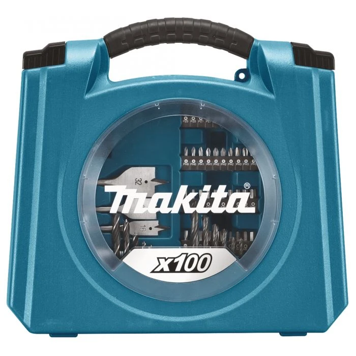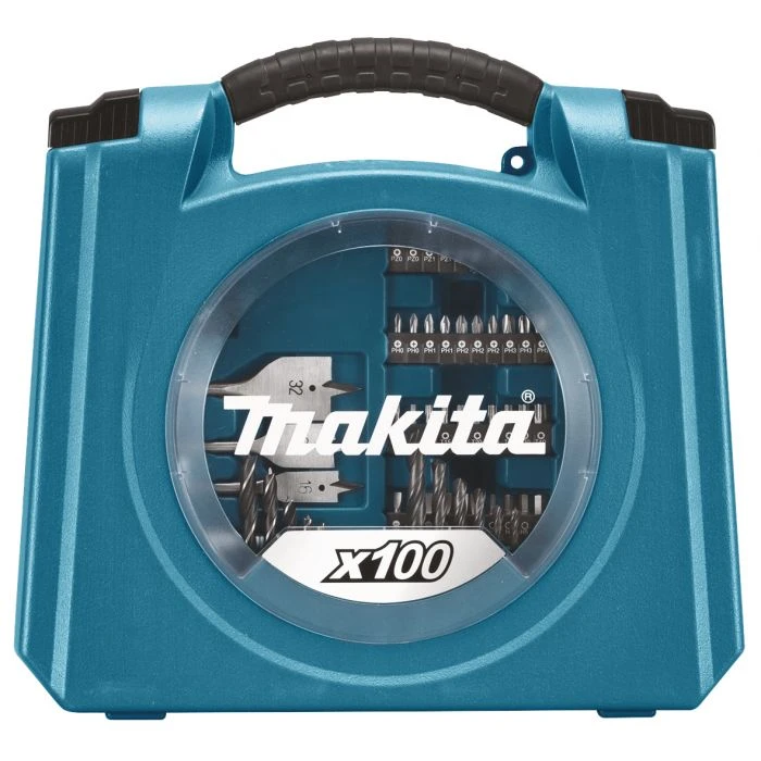 100-delige Makita boor-/schroefbitset met spiraalboren, doppen, schroefbits en diverse accessoires.