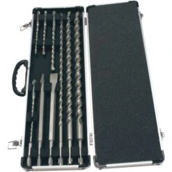 Deze 10-delige boor-/beitelset met SDS-PLUS aansluiting bestaat uit: betonboren 5,5x110mm – 6x110mm – 7x160mm – 8x160mm – 10x210mm – 10x460mm – 16x460mm – 20x460mm puntbeitel 250mm koudbeitel 20x250mm In aluminium koffer.