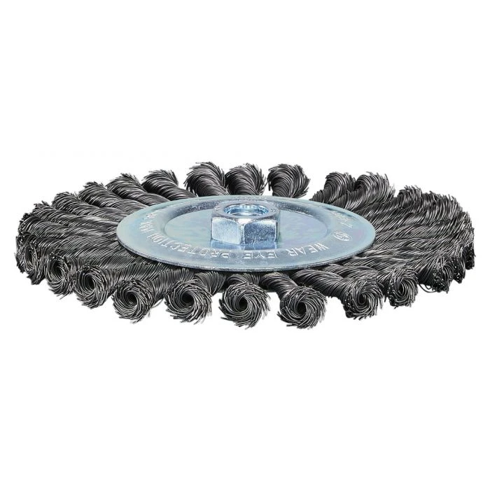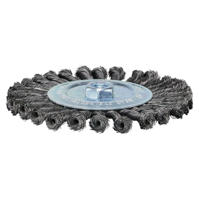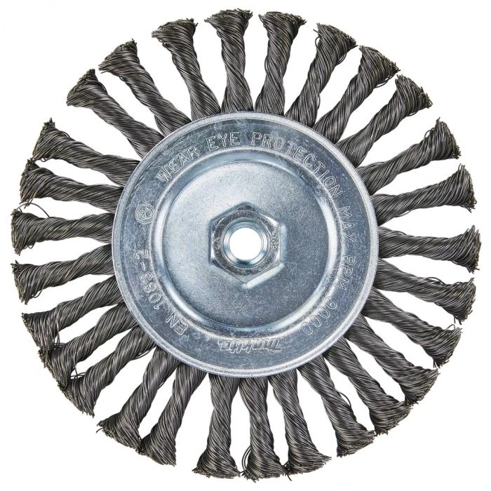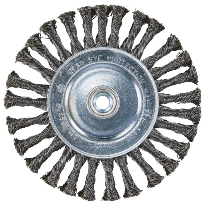 Rondborstel met geknoopt/getordeerd staaldraad, voor de oppervlakte behandeling en reiniging van metaal.