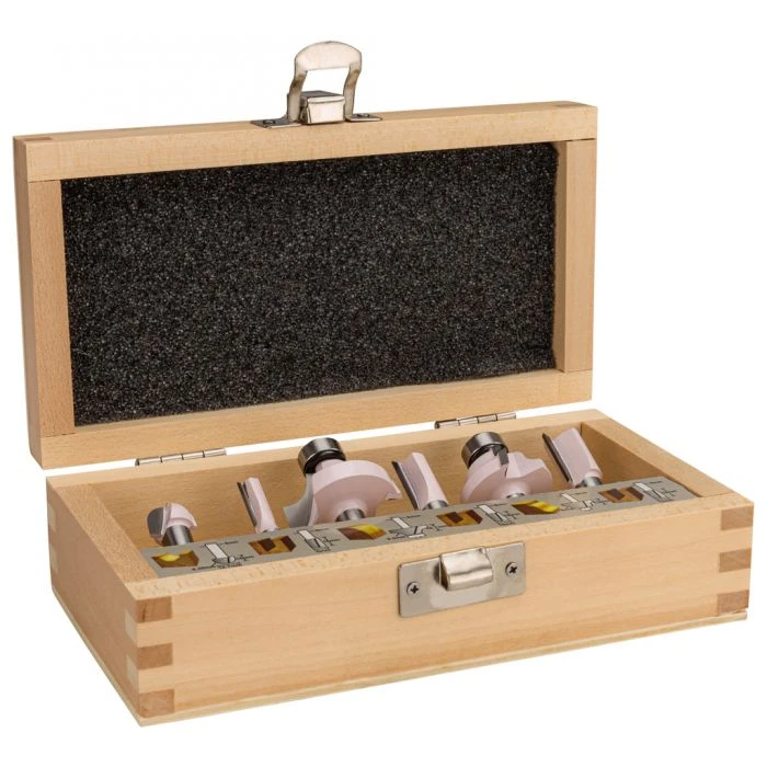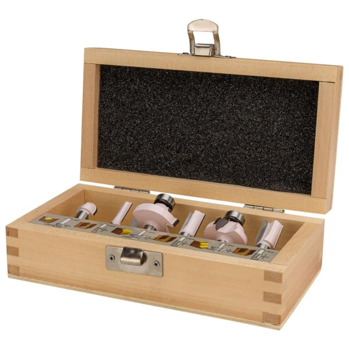 De set bestaat uit een groeffrees 6mm, groeffrees 10mm, groeffrees 12mm, afrondfrees met kogellager, Romeinse ogieffrees en een holprofielfrees.