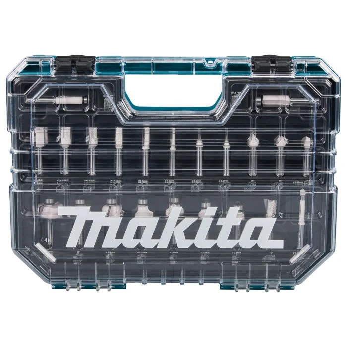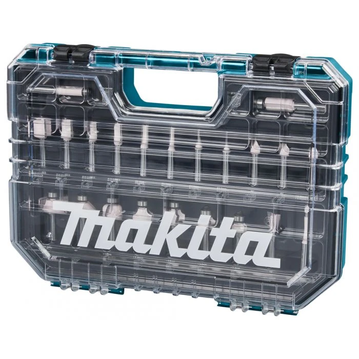 Uitgebreide 22-delige Makita frezenset in overzichtelijke kunststof koffer met transparant deksel.