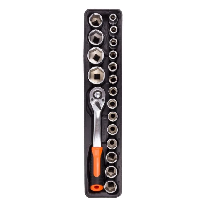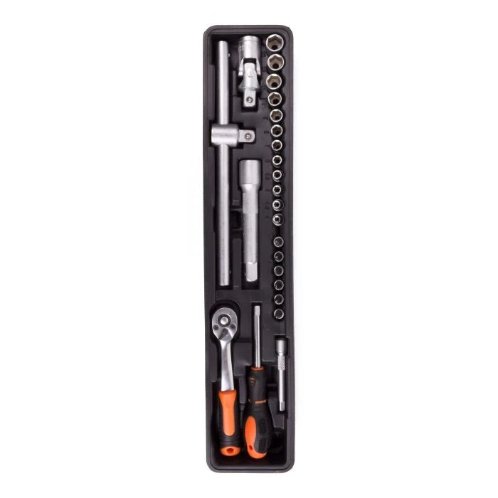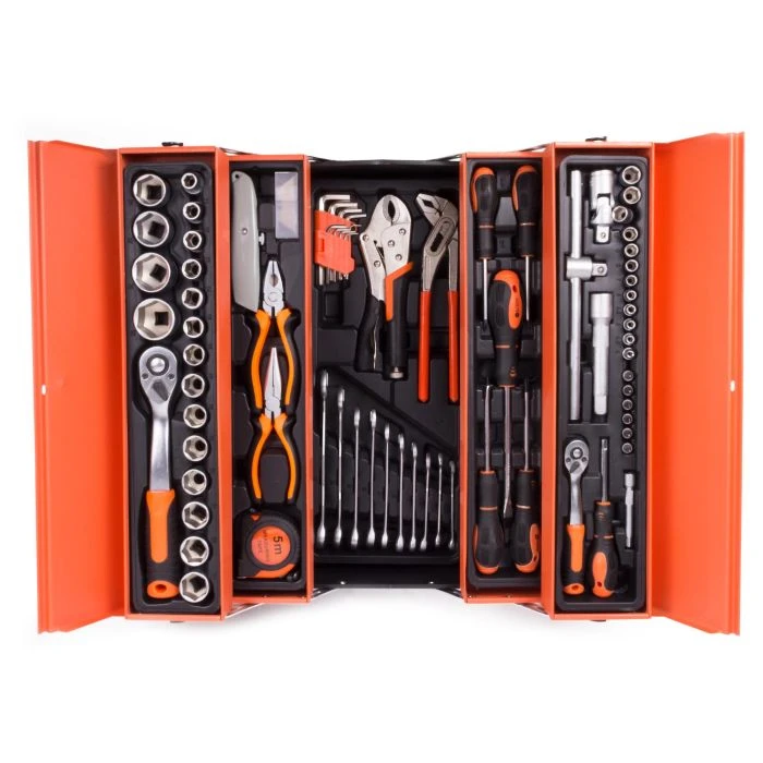 85-delige gereedschapskist goed gevuld met diverse gereedschappen van betrouwbare semi-professionele kwaliteit. Ideaal voor op de boot of in uw garage, maar ook zeer geschikt voor de werkplaats of voor in uw bedrijfswagen. De metalen koffer is voorzien van metalen handgrepen ook is de metalen deksel afsluitbaar doormiddel van een (niet meegeleverd) hangslot. De kunststof inlays zorgen ervoor dat alle gereedschappen overzichtelijk kunnen worden opgeborgen. Geleverd met tal van gereedschappen, zoals combinatietang, waterpomptang, allerlei soorten schroevendraaiers, bits en een 1/4″ en 1/2″ doppenset.