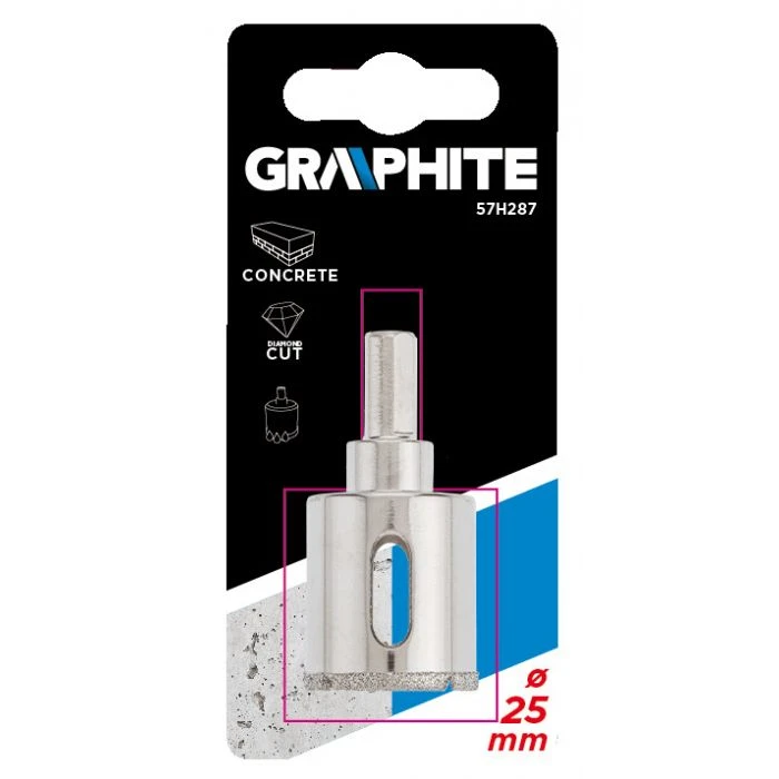 Deze Graphite diamant tegelboor zal tijdens het gebruik met water moeten worden gekoeld ( continu aanvoeren b.v. doormiddel van een plantenspuit). U kunt deze tegelboor gebruiken om door de hardste materialen te boren zoals b.v. hard gebakken (vloer)vloertegels, keramische vloertegels, hardsteen, graniet, marmer, maar ook b.v. glas etc..