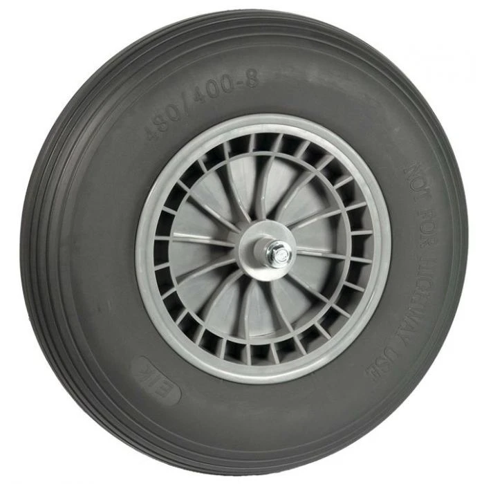 Professionele kwaliteit kruiwagenwiel met massieve band (PU-gevuld) met lijnprofiel, Er zit dus geen lucht meer in de band waardoor de band nooit lek kan komen staan! Passend op nagenoeg alle kruiwagens (as 13 cm.). 4.80/4.00-8