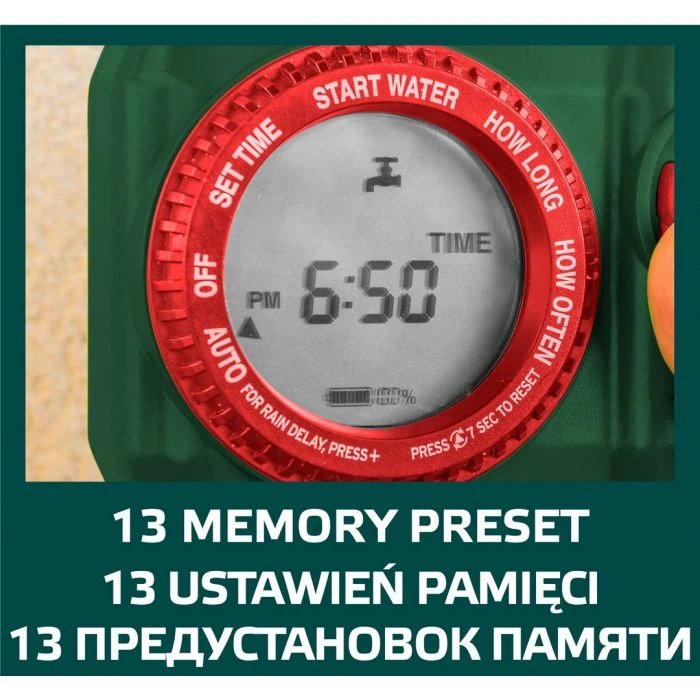 VERTO digitale tijdschakelaar (ref. Nr. 15G751) beschikt over 4 functiebedieningsknoppen. Met de timer kunnen 13 waterfrequenties worden geprogrammeerd binnen een bereik van 360 minuten. Het apparaat beschikt over een batterijniveau-indicator. Voorzien van Nederlandse gebruiksaanwijzing.