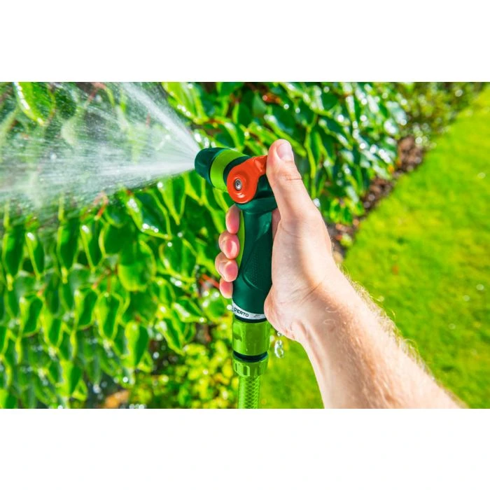 VERTO waterspuitpistool (ref. Nr. 15G703) maakt een continue aanpassing van de waterstroom met de duim mogelijk. Verstelbare kop maakt het mogelijk om de vorm van de waterstroom op te zetten, van mist tot sterke spotstroom. Handgreep met ergonomische vorm ligt goed in de hand en glijdt niet weg, wat het comfort op het werk verbetert.