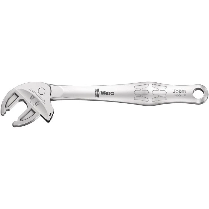 Veel gebruikers zouden graag willen beschikken over een universeel gereedschap dat voor zoveel mogelijk zaken te gebruiken is. Eén stuk gereedschap voor meerdere metrische en duimse maten. En dit zou zich dan ook nog eens automatisch aan de verschillende schroefmaten moeten aanpassen. Veilig vastgrijpen, niets beschadigen en een hoge werksnelheid mogelijk maken. Middels de traploos en parallel lopende bekken worden meerdere steeksleutelformaten vervangen. De vereiste maat wordt automatisch bij het aanzetten op de zeskant-moer en schroef ingesteld. Het geïntegreerde hefboommechanisme klemt de zeskant-schroef resp. moer tussen de bekken veilig in, hetgeen het risico op wegglijden en beschadigingen aanzienlijk verkleint. De ratelfunctie maak snel en soepel schroeven zonder telkens het gereedschap te moeten verplaatsen mogelijk. Door toepassing van hoekprisma’s wordt een terughaalhoek van slechts 30° gerealiseerd. De 1-zijde-constructie in combinatie met de ratelfunctie en het hoekprisma maakt werken in krappe ruimtes mogelijk. De instelbare Joker 6004 is hét universele schroefgereedschap. Zelfinstellend. Vastgrijpend.