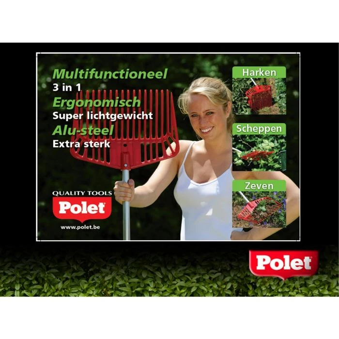 Multifunctioneel : kan gebruikt worden om te harken, scheppen en zeven